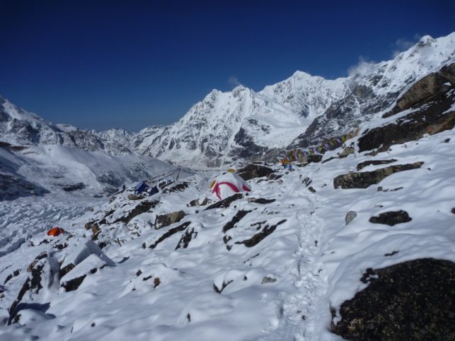 Dorjee, notre cuisinier se plie en quatre pour que nous nous nourrissions le mieux possible pour prendre des forces. Après demain nous avons l'intention de monter au C1. Nous squattons souvent la cuisine, l'endroit le plus chaud ; tant pis pour les odeurs de kérosène, mélangées à celles de nourriture. Et puis de toute façon, nous n'avons pas de tente mess pour l'instant : elle se trouve quelque part sur le trek, à plusieurs jours d'ici, avec l'ordi, la nourriture pour un mois et de nombreuses choses encore, ainsi que Pemba (notre Sirdar) qui se bat pour faire avancer les porteurs, pas très motivés. Quand on vient au Népal, on sait qu'il y aura des aléas ; il faut faire comme le roseau : s'adapter. Ceci dit, tout le monde va bien.